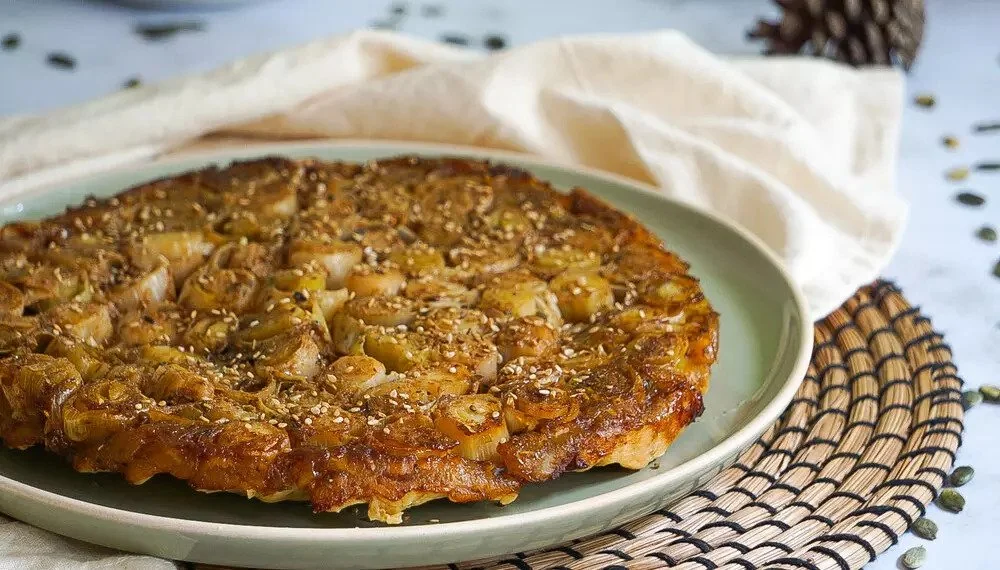 Tarte tatin aux poireaux à la moutarde et balsamique (vegan)
