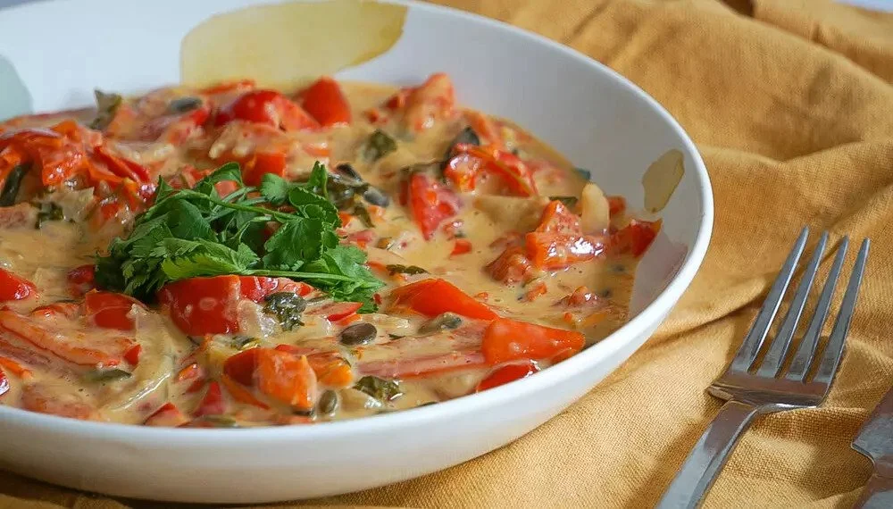 Cette recette… c’était vraiment ma recette chouchou cet été… Tellement simple et à la fois si savoureuse ! Le mélange du lait de coco avec les poivrons qui viennent le parfumer… Et en même temps super réconfortante, avec l’arrivée du froid, je n’ai pas résisté aux derniers poivrons de la saison !